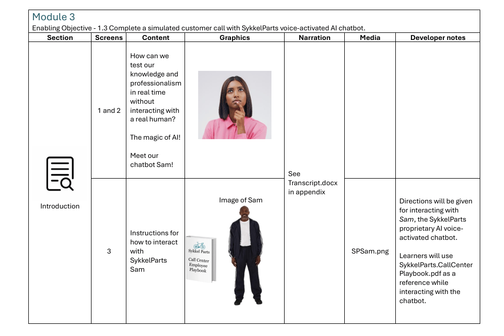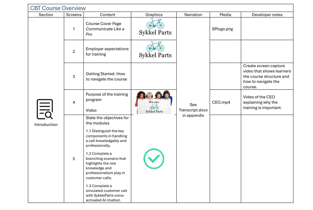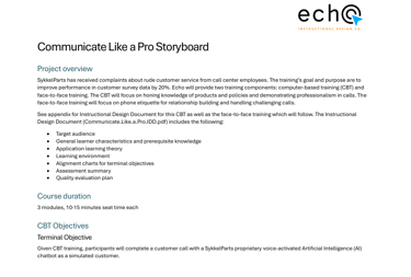This detailed storyboard outlines the structure, content, and interactive elements of the Communicate Like a Pro computer-based training, ensuring alignment with learning objectives and providing a clear blueprint for development.